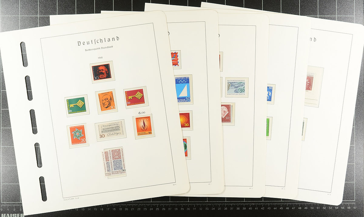 Post-war collection up to 1973 with a nice selection of regular issue and semi-postal on very nice Lighthouse hingeless pages (no springback binder). The German Federation issues are the strongest, including some nice used "portraits" issues #B310-313, #B320-323, #B327-B330, the used Beethoven souvenir sheet, etc (catalogues US$812.00). The Berlin material is not as strong with a couple of hundred dollars of catalogue value. If purchased today, the pages alone retail at $500.00! And US$1000.00 of catalogue value. Estimate =