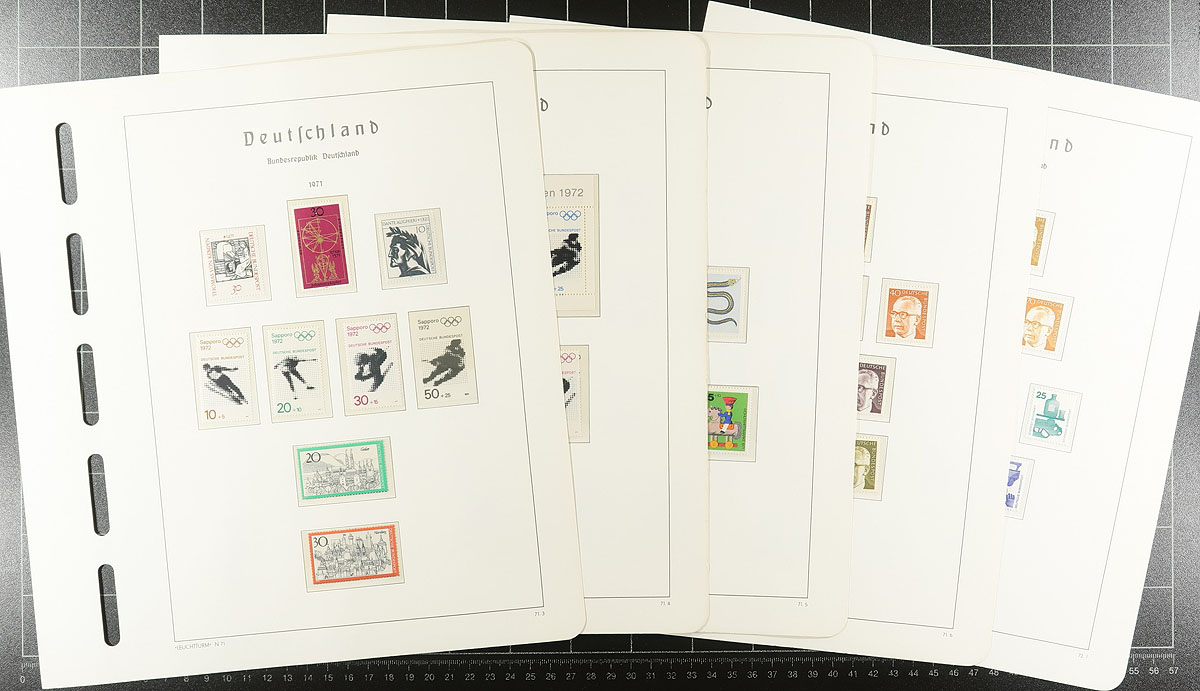 Post-war collection up to 1973 with a nice selection of regular issue and semi-postal on very nice Lighthouse hingeless pages (no springback binder). The German Federation issues are the strongest, including some nice used "portraits" issues #B310-313, #B320-323, #B327-B330, the used Beethoven souvenir sheet, etc (catalogues US$812.00). The Berlin material is not as strong with a couple of hundred dollars of catalogue value. If purchased today, the pages alone retail at $500.00! And US$1000.00 of catalogue value. Estimate =