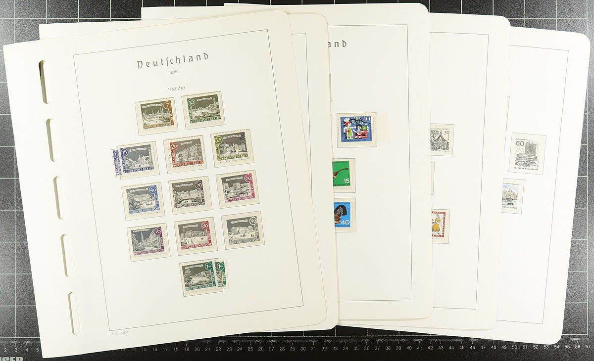 Post-war collection up to 1973 with a nice selection of regular issue and semi-postal on very nice Lighthouse hingeless pages (no springback binder). The German Federation issues are the strongest, including some nice used "portraits" issues #B310-313, #B320-323, #B327-B330, the used Beethoven souvenir sheet, etc (catalogues US$812.00). The Berlin material is not as strong with a couple of hundred dollars of catalogue value. If purchased today, the pages alone retail at $500.00! And US$1000.00 of catalogue value. Estimate =