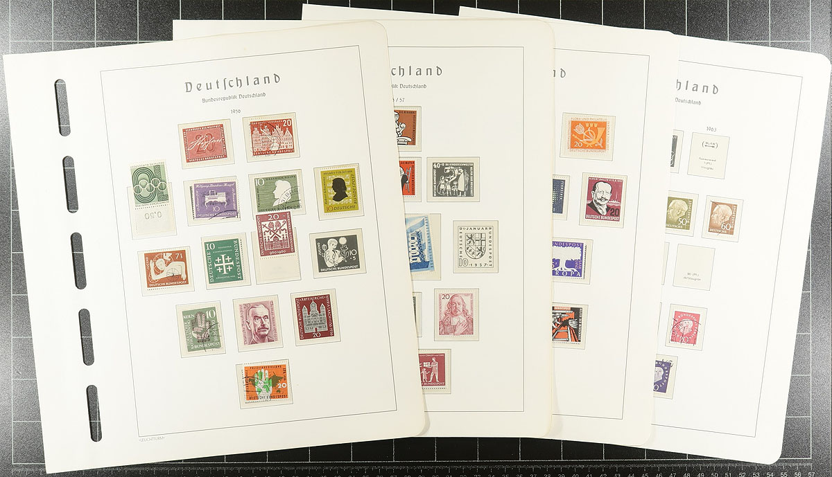 Post-war collection up to 1973 with a nice selection of regular issue and semi-postal on very nice Lighthouse hingeless pages (no springback binder). The German Federation issues are the strongest, including some nice used "portraits" issues #B310-313, #B320-323, #B327-B330, the used Beethoven souvenir sheet, etc (catalogues US$812.00). The Berlin material is not as strong with a couple of hundred dollars of catalogue value. If purchased today, the pages alone retail at $500.00! And US$1000.00 of catalogue value. Estimate =