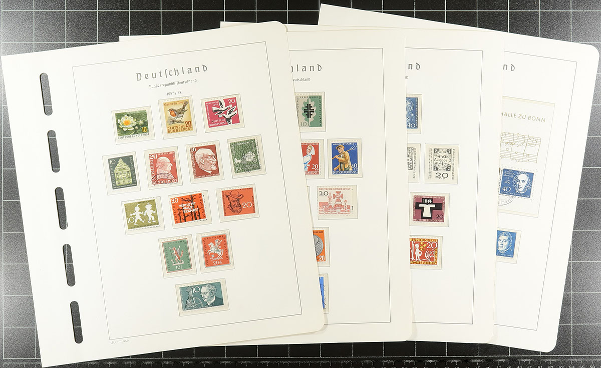 Post-war collection up to 1973 with a nice selection of regular issue and semi-postal on very nice Lighthouse hingeless pages (no springback binder). The German Federation issues are the strongest, including some nice used "portraits" issues #B310-313, #B320-323, #B327-B330, the used Beethoven souvenir sheet, etc (catalogues US$812.00). The Berlin material is not as strong with a couple of hundred dollars of catalogue value. If purchased today, the pages alone retail at $500.00! And US$1000.00 of catalogue value. Estimate =