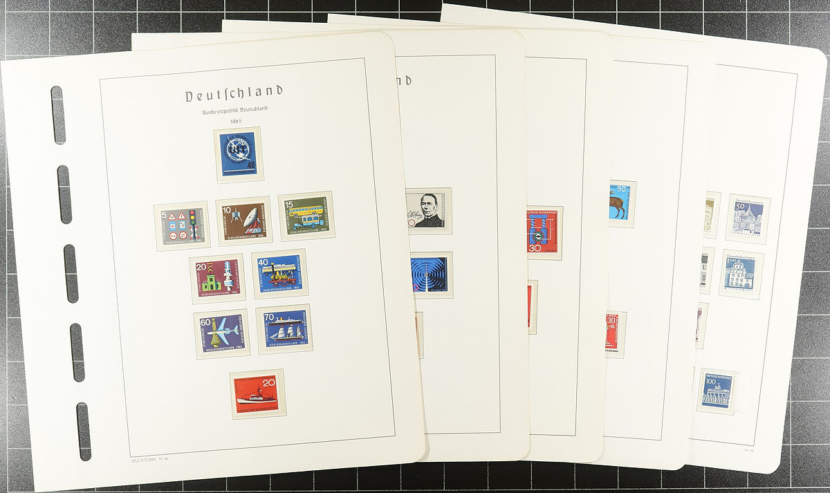 Post-war collection up to 1973 with a nice selection of regular issue and semi-postal on very nice Lighthouse hingeless pages (no springback binder). The German Federation issues are the strongest, including some nice used "portraits" issues #B310-313, #B320-323, #B327-B330, the used Beethoven souvenir sheet, etc (catalogues US$812.00). The Berlin material is not as strong with a couple of hundred dollars of catalogue value. If purchased today, the pages alone retail at $500.00! And US$1000.00 of catalogue value. Estimate =