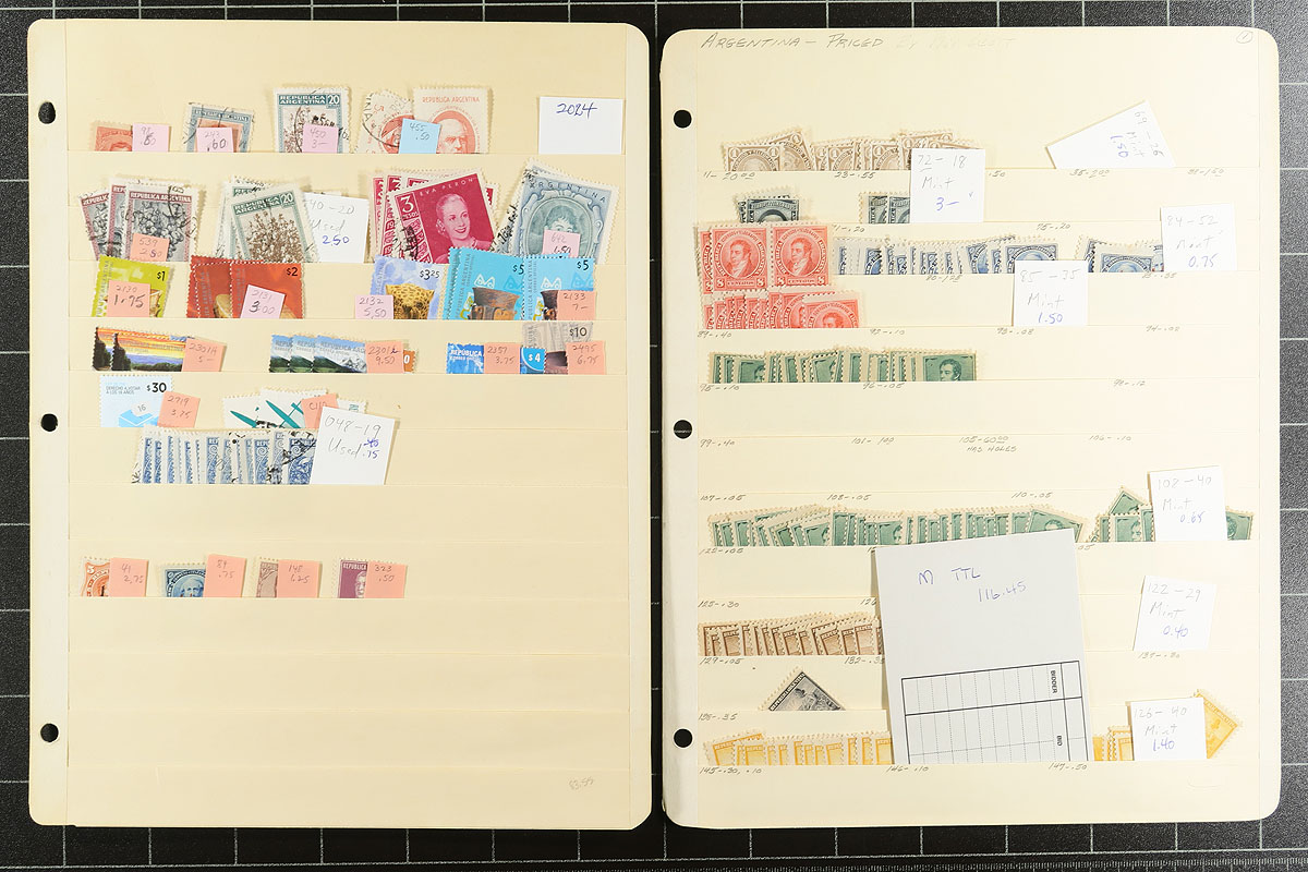 A South America holding on over 30 manila stockpages. Strongest is Argentina, Bolivia, Brazil and Venezuela, but there are touches of a few other countries. Mint, used, mostly pre-1960, lots of back of the book and moderate to heavy duplication in places. Most identified with recent Scott catalogue values. Most are up to $8.00 catalogue value, with a couple of better. Estimate =