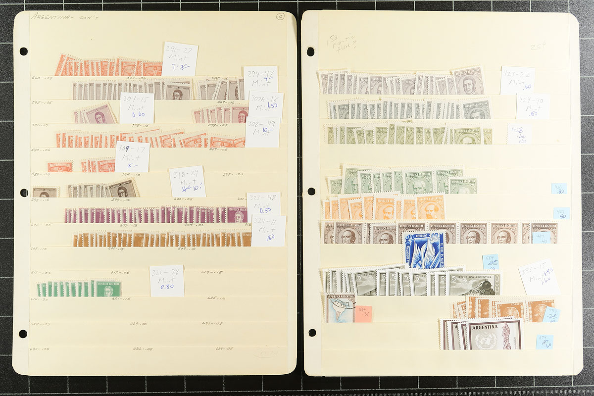 A South America holding on over 30 manila stockpages. Strongest is Argentina, Bolivia, Brazil and Venezuela, but there are touches of a few other countries. Mint, used, mostly pre-1960, lots of back of the book and moderate to heavy duplication in places. Most identified with recent Scott catalogue values. Most are up to $8.00 catalogue value, with a couple of better. Estimate =