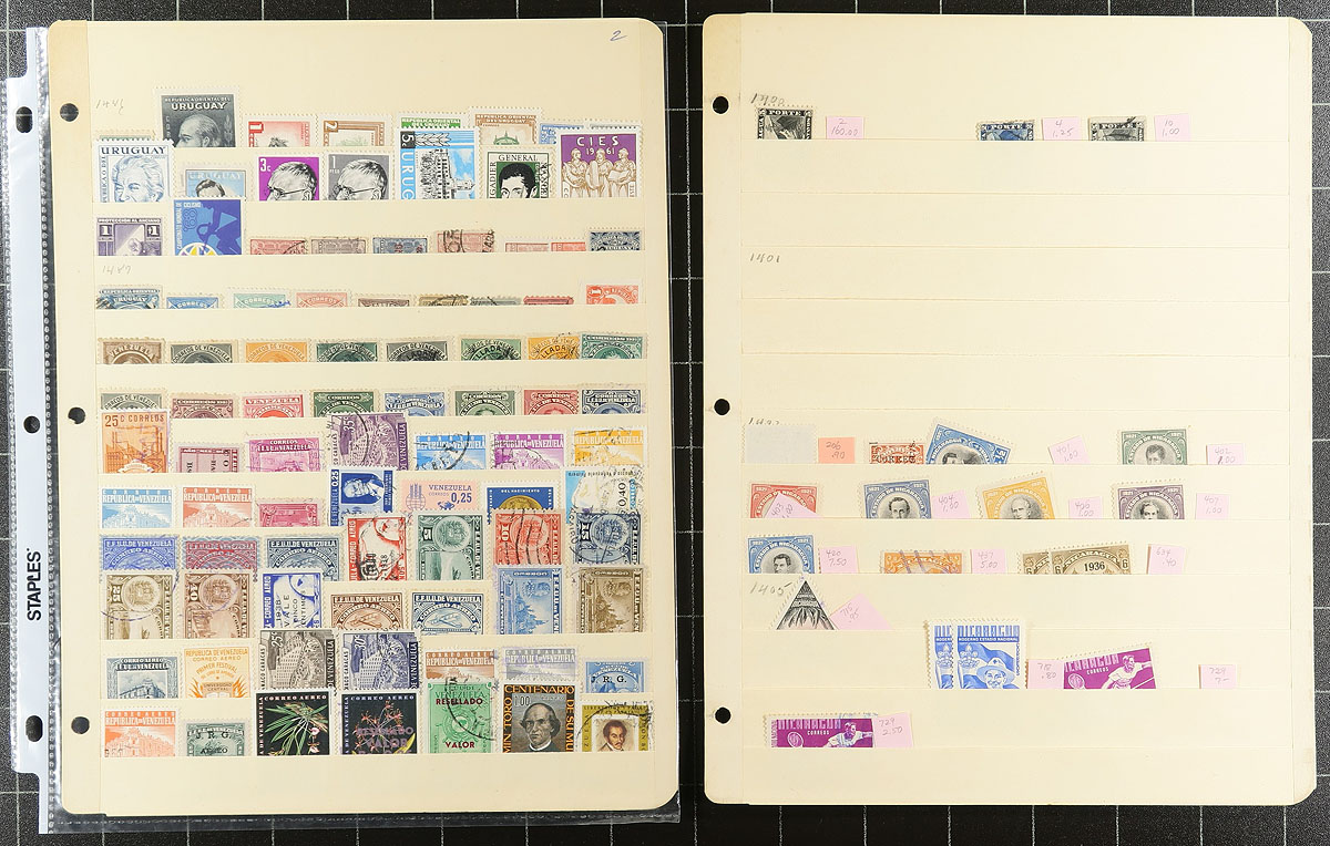 A South America holding on over 30 manila stockpages. Strongest is Argentina, Bolivia, Brazil and Venezuela, but there are touches of a few other countries. Mint, used, mostly pre-1960, lots of back of the book and moderate to heavy duplication in places. Most identified with recent Scott catalogue values. Most are up to $8.00 catalogue value, with a couple of better. Estimate =