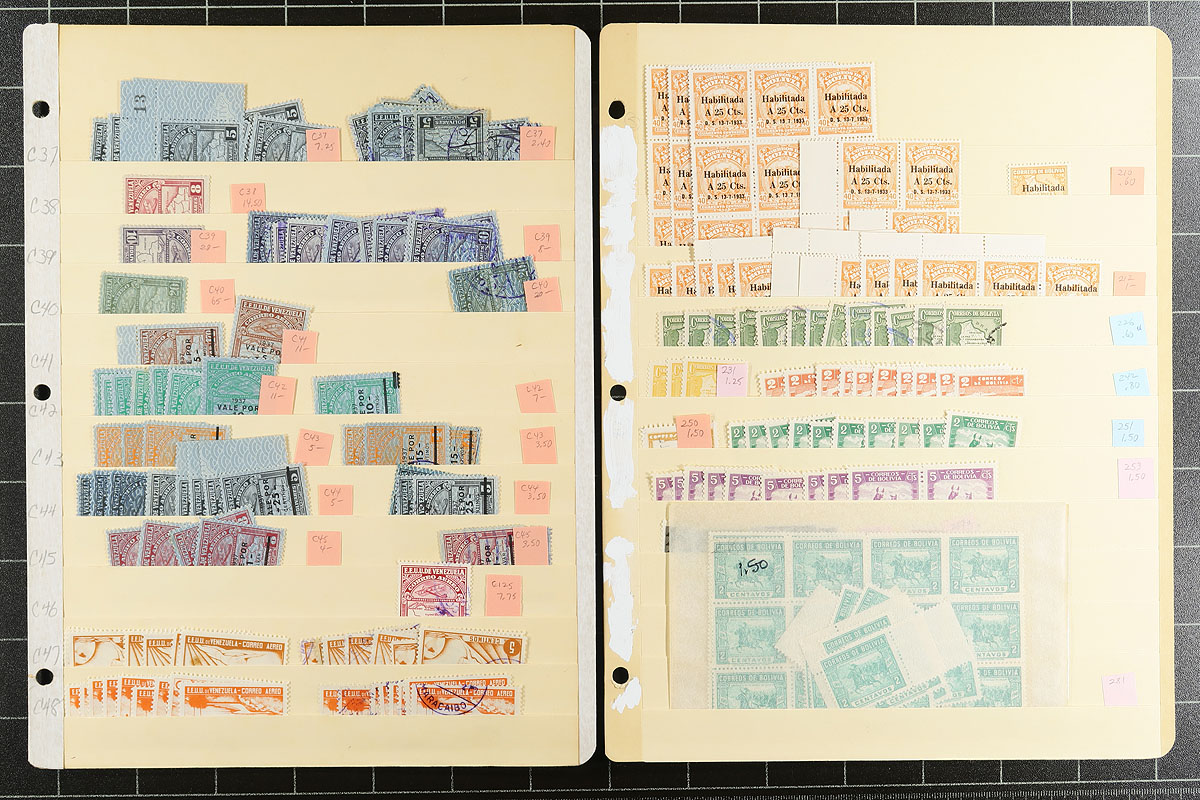 A South America holding on over 30 manila stockpages. Strongest is Argentina, Bolivia, Brazil and Venezuela, but there are touches of a few other countries. Mint, used, mostly pre-1960, lots of back of the book and moderate to heavy duplication in places. Most identified with recent Scott catalogue values. Most are up to $8.00 catalogue value, with a couple of better. Estimate =