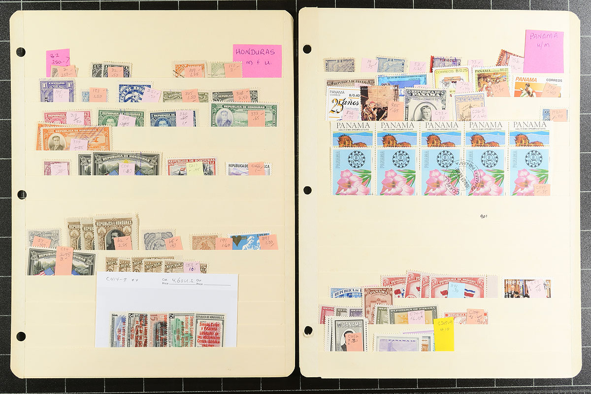 A Latin America holding on a couple dozen manila stockpages. Arranged in alphabetical order by country, with Chile, Colombia, Costa Rica, Paraguay, Peru, El Salvador, Uruguay, Venezuela. Mint, used, mostly pre-1970, lots of back of the book and moderate to heavy duplication in places. Most identified with recent Scott catalogue values of up to $8.00 each, with a couple of better. There is also some fun or dubious material, identified by the consignor to help round out your collection and increase your expertise at the same time. Estimate =