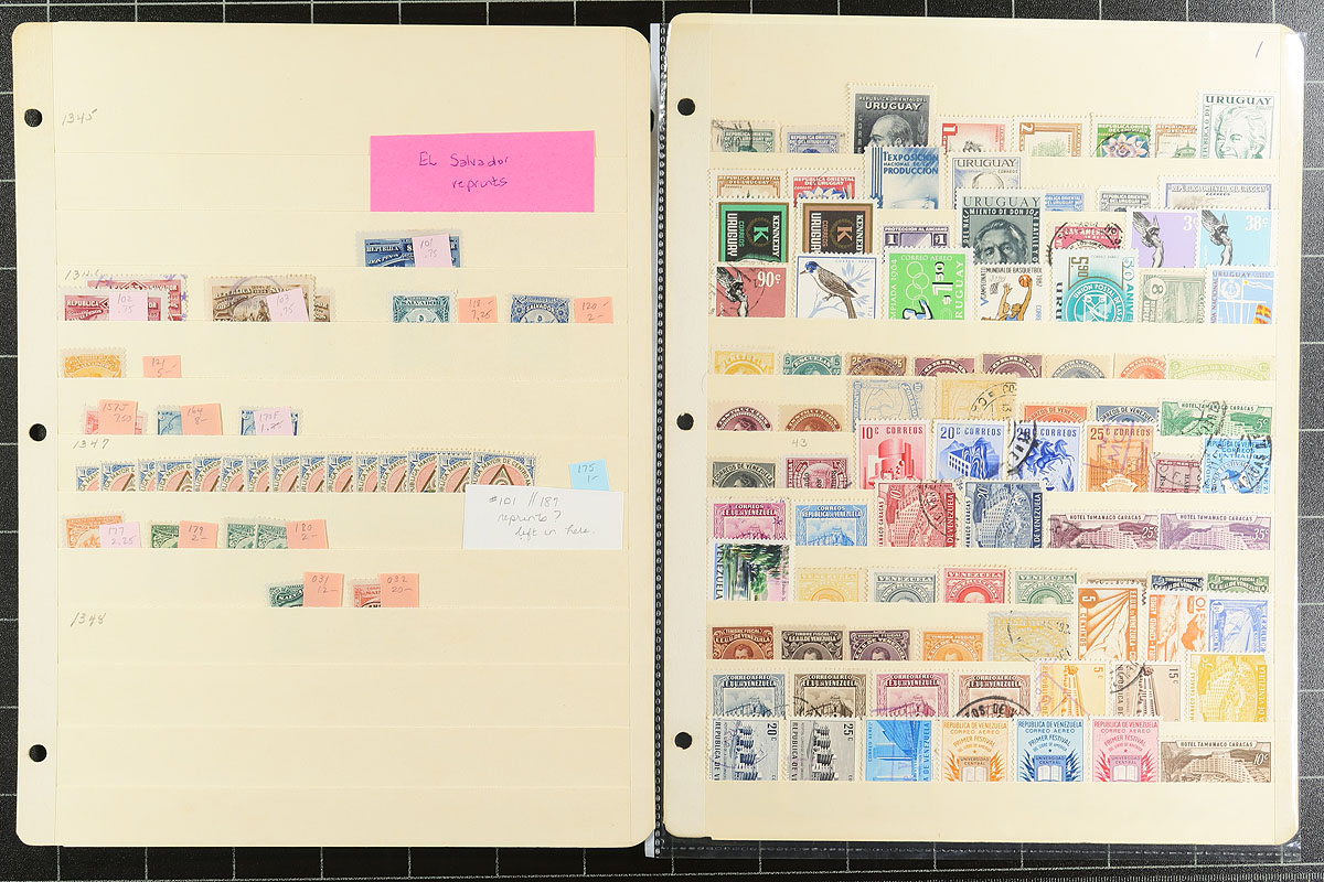 A Latin America holding on a couple dozen manila stockpages. Arranged in alphabetical order by country, with Chile, Colombia, Costa Rica, Paraguay, Peru, El Salvador, Uruguay, Venezuela. Mint, used, mostly pre-1970, lots of back of the book and moderate to heavy duplication in places. Most identified with recent Scott catalogue values of up to $8.00 each, with a couple of better. There is also some fun or dubious material, identified by the consignor to help round out your collection and increase your expertise at the same time. Estimate =