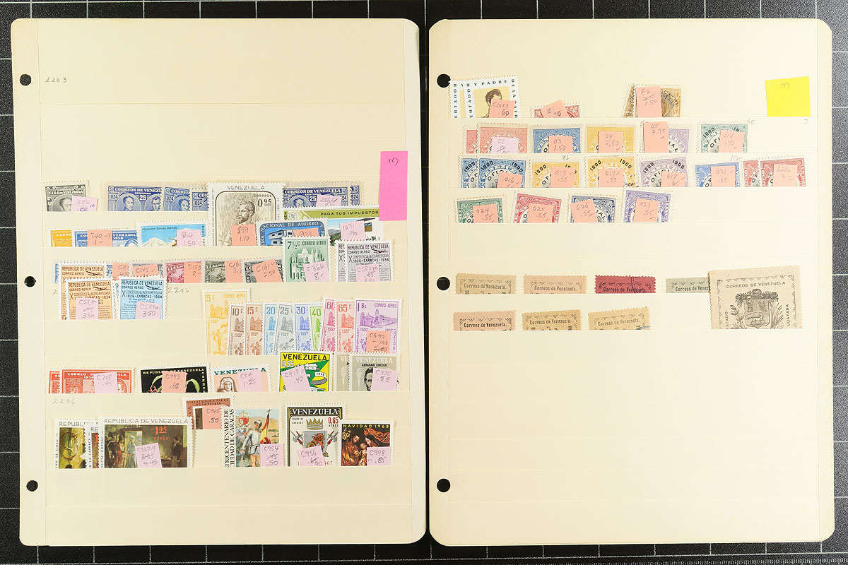A Latin America holding on a couple dozen manila stockpages. Arranged in alphabetical order by country, with Chile, Colombia, Costa Rica, Paraguay, Peru, El Salvador, Uruguay, Venezuela. Mint, used, mostly pre-1970, lots of back of the book and moderate to heavy duplication in places. Most identified with recent Scott catalogue values of up to $8.00 each, with a couple of better. There is also some fun or dubious material, identified by the consignor to help round out your collection and increase your expertise at the same time. Estimate =