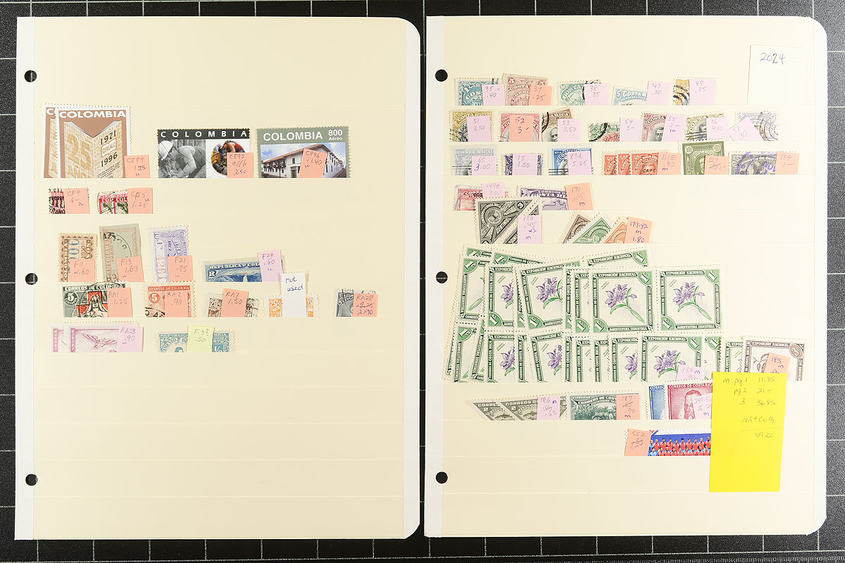 A Latin America holding on a couple dozen manila stockpages. Arranged in alphabetical order by country, with Chile, Colombia, Costa Rica, Paraguay, Peru, El Salvador, Uruguay, Venezuela. Mint, used, mostly pre-1970, lots of back of the book and moderate to heavy duplication in places. Most identified with recent Scott catalogue values of up to $8.00 each, with a couple of better. There is also some fun or dubious material, identified by the consignor to help round out your collection and increase your expertise at the same time. Estimate =