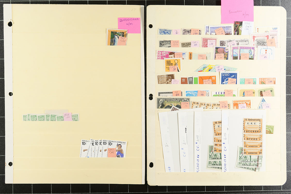 A Latin America holding on a couple dozen manila stockpages. Arranged in alphabetical order by country, with Chile, Colombia, Costa Rica, Paraguay, Peru, El Salvador, Uruguay, Venezuela. Mint, used, mostly pre-1970, lots of back of the book and moderate to heavy duplication in places. Most identified with recent Scott catalogue values of up to $8.00 each, with a couple of better. There is also some fun or dubious material, identified by the consignor to help round out your collection and increase your expertise at the same time. Estimate =