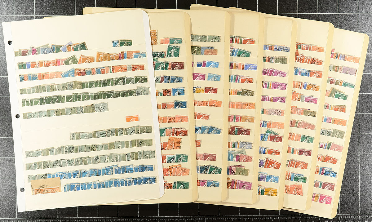 "Sower"-stravaganza. A massive holding of used. Part 1 is a shoebox with thousands of examples sorted by Scott number into envelopes. Part 2 is a seemingly unorganized accumulation packed into 50 manila stockpages, with no obvious pattern of storage. Presumably there is cancel potential and exploration opportunities for the specialist, and who knows what else. Our estimate is that there could be over 15,000 stamps here. Estimate =