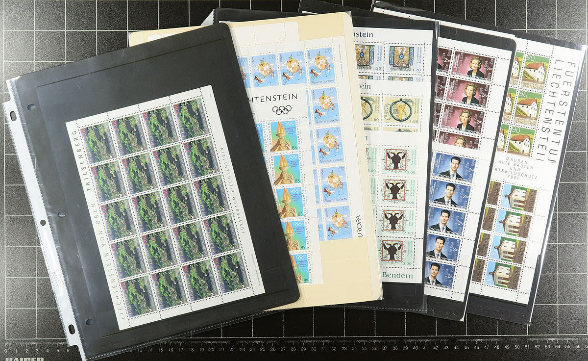 Sheetlet hoard #8, a bit hit or miss group of sheetlets of 20, all mint never hinged and issued between 2001-2005. Includes "Buildings", "Royalty", "Aerial Views", "Olympics" etc. An attractive grouping. These issues have relatively low print quantities and outrageous original face value (due to the Swiss Franc being the currency in use). Catalogue value is often at (or less than) the face value. 2024 Scott US$930.00 =
