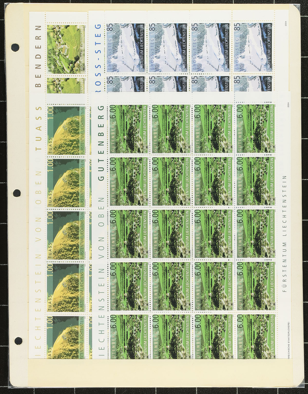 Sheetlet hoard #8, a bit hit or miss group of sheetlets of 20, all mint never hinged and issued between 2001-2005. Includes "Buildings", "Royalty", "Aerial Views", "Olympics" etc. An attractive grouping. These issues have relatively low print quantities and outrageous original face value (due to the Swiss Franc being the currency in use). Catalogue value is often at (or less than) the face value. 2024 Scott US$930.00 =