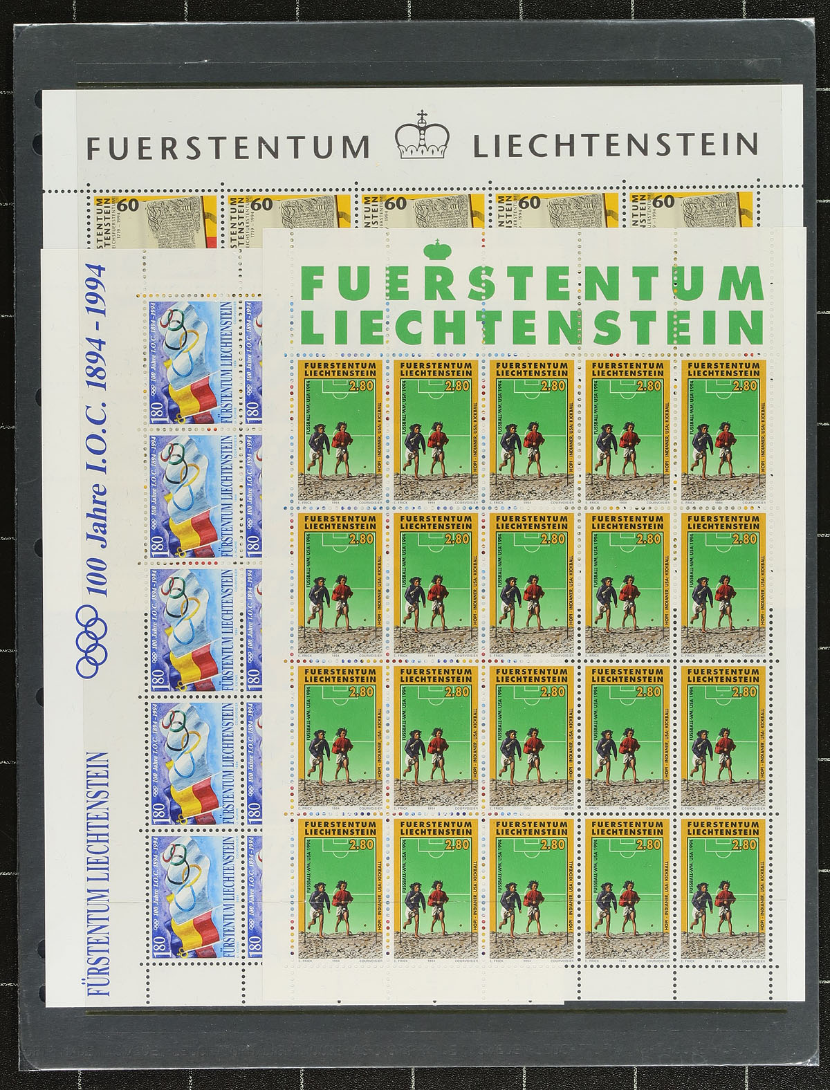 Sheetlet hoard #5, a near-complete group of sheetlets of 20, all mint never hinged issued in 1994. Includes "World Cup", "Olympics", Birds", "Letter Writing", "Minerals", "Christmas" etc. An attractive grouping. These issues have relatively low print quantities and outrageous original face value (due to the Swiss Franc being the currency in use). Catalogue value is often at (or less than) the face value. 2024 Scott US$435.00 =
