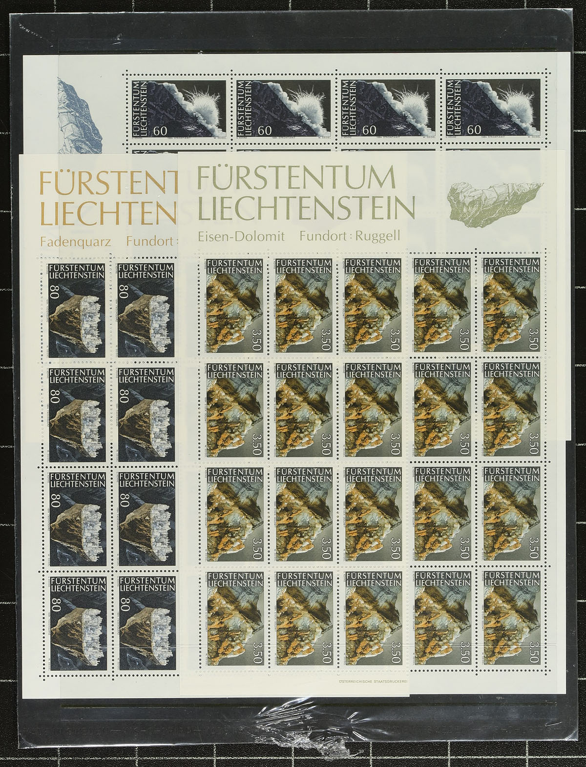 Sheetlet hoard #5, a near-complete group of sheetlets of 20, all mint never hinged issued in 1994. Includes "World Cup", "Olympics", Birds", "Letter Writing", "Minerals", "Christmas" etc. An attractive grouping. These issues have relatively low print quantities and outrageous original face value (due to the Swiss Franc being the currency in use). Catalogue value is often at (or less than) the face value. 2024 Scott US$435.00 =