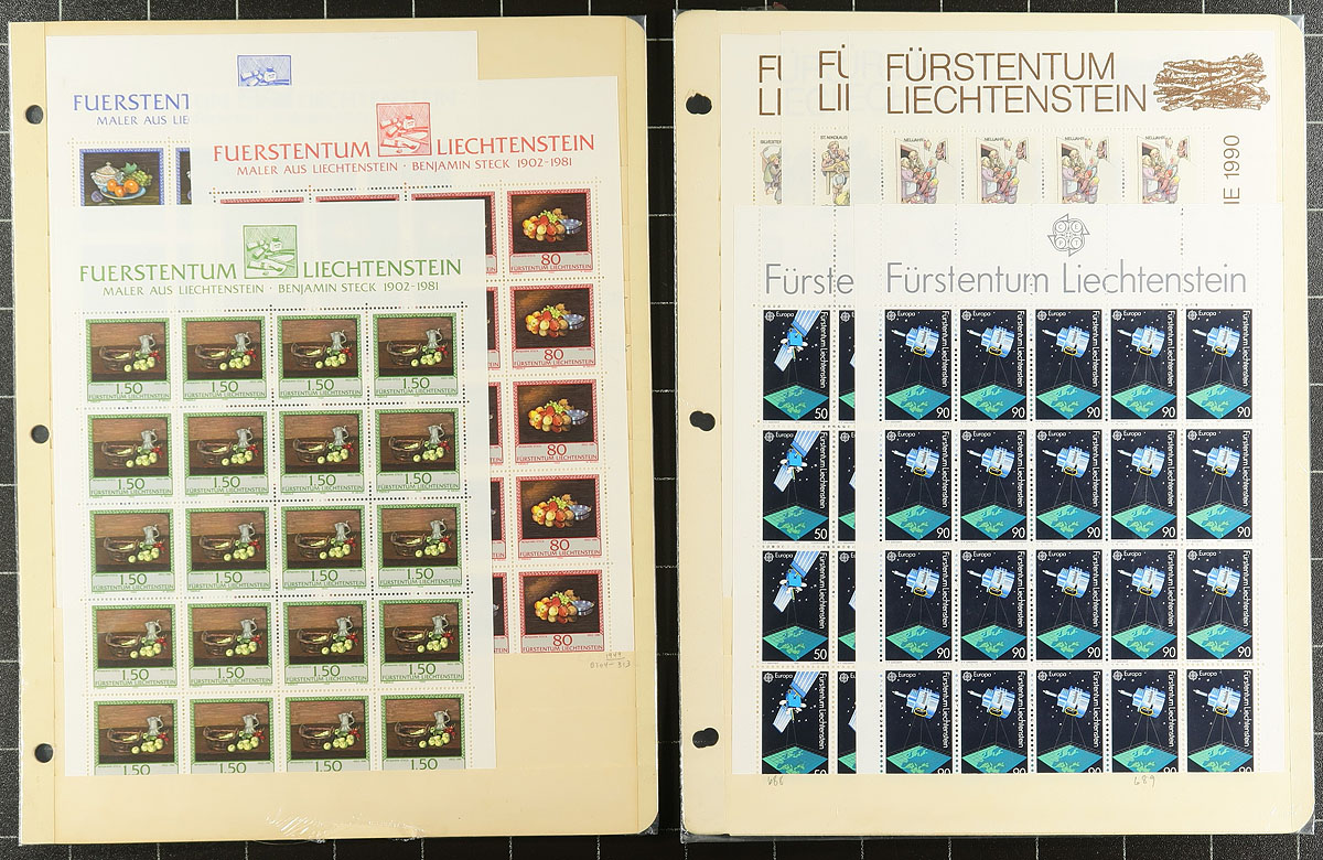Sheetlet hoard #3. A decent grouping of sheetlets of 20, all mint never hinged and issued between 1990-1991. Includes "Mountains", UN, "Paintings", "Penny Black", Europa, etc. An attractive grouping. These issues have relatively low print quantities and outrageous original face value (due to the Swiss Franc being the currency in use). Catalogue value is often at (or less than) the face value. 2024 Scott US$941.00 =