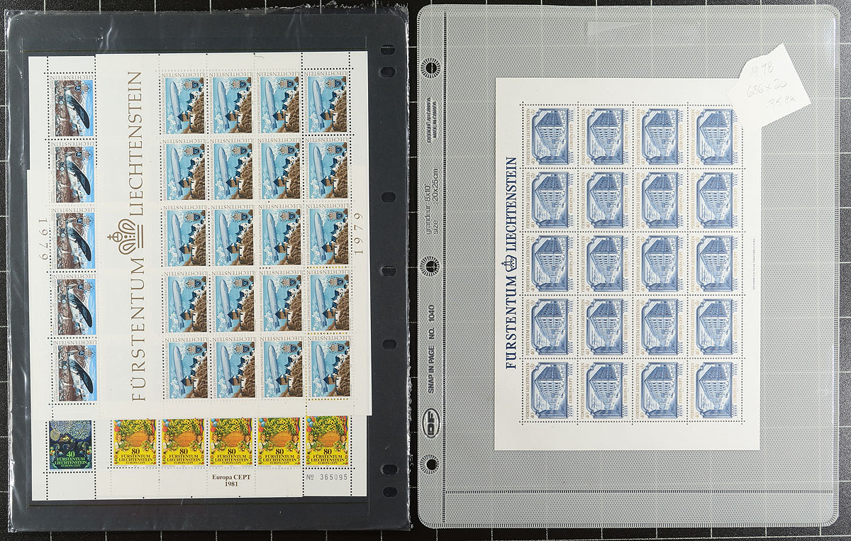 Sheetlet hoard #1, a mixed bag of sheetlets of 20 (or 8, or 12 and a couple of souvenir sheets), all mint never hinged and issued between 1956-1979. An attractive grouping, created from different sources, meaning that a bit of minor duplication is to be expected (a few are in original sales folders). These issues have relatively low print quantities and outrageous original face value (due to the Swiss Franc being the currency in use). Catalogue value is often at (or less than) the face value. A couple of damaged items are not counted in the 2024 Scott US$700.00 =
