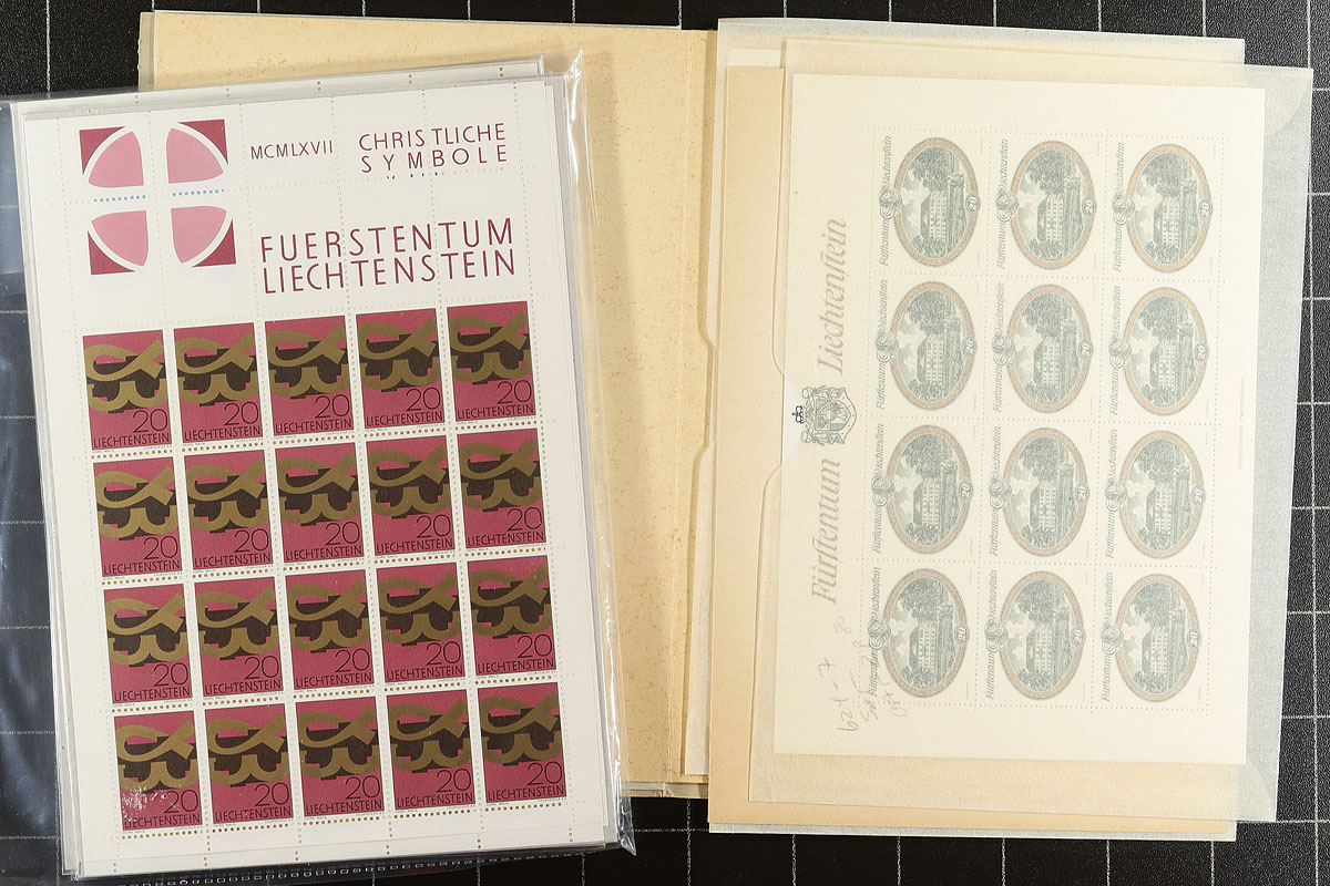 Sheetlet hoard #1, a mixed bag of sheetlets of 20 (or 8, or 12 and a couple of souvenir sheets), all mint never hinged and issued between 1956-1979. An attractive grouping, created from different sources, meaning that a bit of minor duplication is to be expected (a few are in original sales folders). These issues have relatively low print quantities and outrageous original face value (due to the Swiss Franc being the currency in use). Catalogue value is often at (or less than) the face value. A couple of damaged items are not counted in the 2024 Scott US$700.00 =