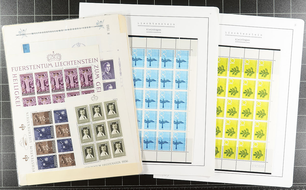 Sheetlet hoard #1, a mixed bag of sheetlets of 20 (or 8, or 12 and a couple of souvenir sheets), all mint never hinged and issued between 1956-1979. An attractive grouping, created from different sources, meaning that a bit of minor duplication is to be expected (a few are in original sales folders). These issues have relatively low print quantities and outrageous original face value (due to the Swiss Franc being the currency in use). Catalogue value is often at (or less than) the face value. A couple of damaged items are not counted in the 2024 Scott US$700.00 =