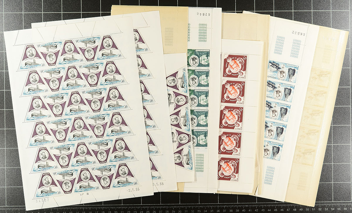 Group of sheetlets and mini-sheets issued between 1950 and 2000, with a bit more from the "Classic" era, such as a wholesale group of "Jules Verne" sheets, "Prince Ranier", some Europa issues and a bit from the turn of the century.). All appear to be very fine, mint, never hinged. A few singles and partial sheetlets are not counted, with a catalogue value exceeding US$1000.00. Estimate =