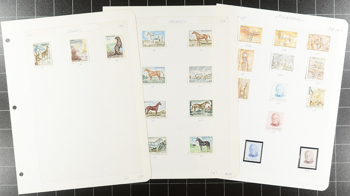 Collection Clutch #3: A group of bid board and auction lots from a local estate which were bought and then set aside. It was a substantial group which we have split into 5, each one has its own character. There is generally more mint than used, with some back of the book, with a mix of common and better items. Expect some duplication and a bit of mixed condition. Material covers just over a century after the 1880s. This lot includes a bit of classic material (#20 mint Prince Albert I VG with heavy hinge remnants), #110-130 used (#127 perfin), a nice accumulation of mint Princes Grace 1956-59 (includes a colour proof strip of 5). Some other loose material is included but not counted in the estimated catalogue value of several hundred dollars. Estimate =