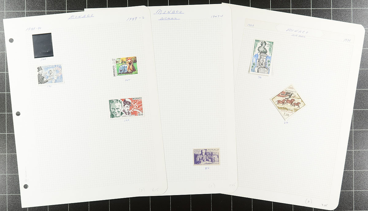 Collection Clutch #3: A group of bid board and auction lots from a local estate which were bought and then set aside. It was a substantial group which we have split into 5, each one has its own character. There is generally more mint than used, with some back of the book, with a mix of common and better items. Expect some duplication and a bit of mixed condition. Material covers just over a century after the 1880s. This lot includes a bit of classic material (#20 mint Prince Albert I VG with heavy hinge remnants), #110-130 used (#127 perfin), a nice accumulation of mint Princes Grace 1956-59 (includes a colour proof strip of 5). Some other loose material is included but not counted in the estimated catalogue value of several hundred dollars. Estimate =