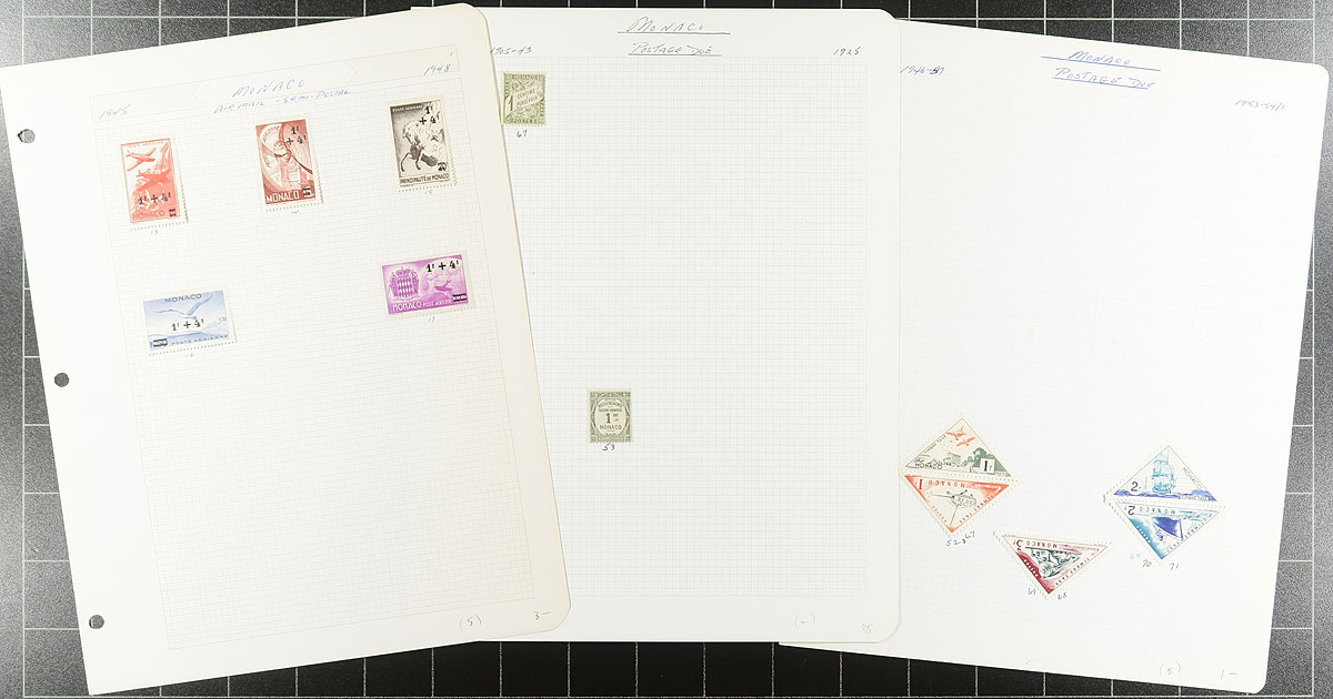 Collection Clutch #3: A group of bid board and auction lots from a local estate which were bought and then set aside. It was a substantial group which we have split into 5, each one has its own character. There is generally more mint than used, with some back of the book, with a mix of common and better items. Expect some duplication and a bit of mixed condition. Material covers just over a century after the 1880s. This lot includes a bit of classic material (#20 mint Prince Albert I VG with heavy hinge remnants), #110-130 used (#127 perfin), a nice accumulation of mint Princes Grace 1956-59 (includes a colour proof strip of 5). Some other loose material is included but not counted in the estimated catalogue value of several hundred dollars. Estimate =