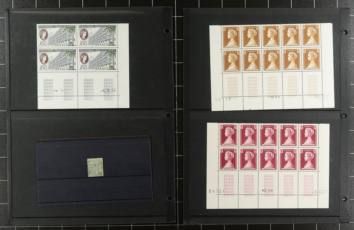 Collection Clutch #3: A group of bid board and auction lots from a local estate which were bought and then set aside. It was a substantial group which we have split into 5, each one has its own character. There is generally more mint than used, with some back of the book, with a mix of common and better items. Expect some duplication and a bit of mixed condition. Material covers just over a century after the 1880s. This lot includes a bit of classic material (#20 mint Prince Albert I VG with heavy hinge remnants), #110-130 used (#127 perfin), a nice accumulation of mint Princes Grace 1956-59 (includes a colour proof strip of 5). Some other loose material is included but not counted in the estimated catalogue value of several hundred dollars. Estimate =