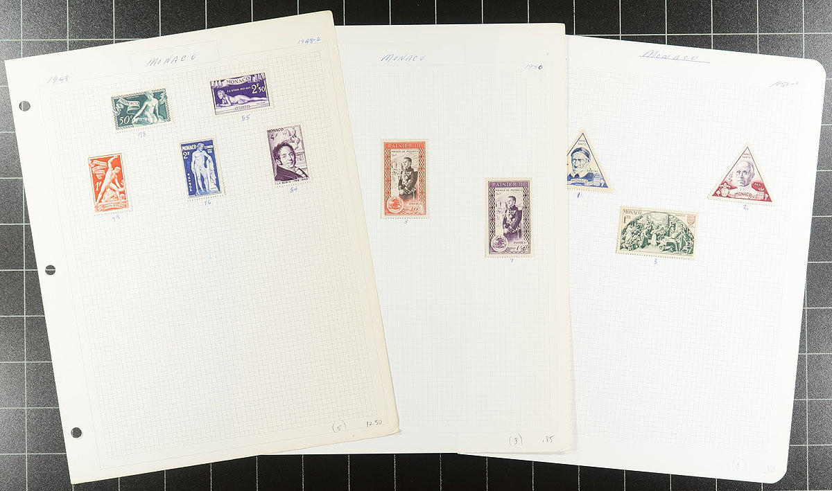 Collection Clutch #3: A group of bid board and auction lots from a local estate which were bought and then set aside. It was a substantial group which we have split into 5, each one has its own character. There is generally more mint than used, with some back of the book, with a mix of common and better items. Expect some duplication and a bit of mixed condition. Material covers just over a century after the 1880s. This lot includes a bit of classic material (#20 mint Prince Albert I VG with heavy hinge remnants), #110-130 used (#127 perfin), a nice accumulation of mint Princes Grace 1956-59 (includes a colour proof strip of 5). Some other loose material is included but not counted in the estimated catalogue value of several hundred dollars. Estimate =