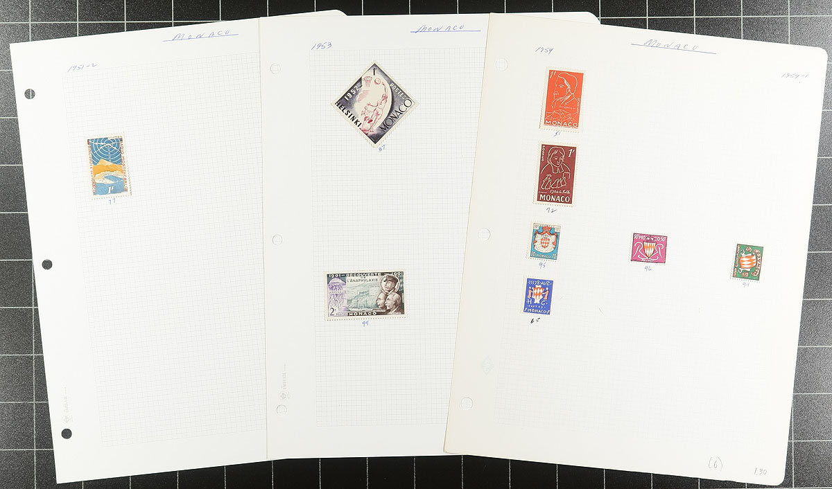 Collection Clutch #3: A group of bid board and auction lots from a local estate which were bought and then set aside. It was a substantial group which we have split into 5, each one has its own character. There is generally more mint than used, with some back of the book, with a mix of common and better items. Expect some duplication and a bit of mixed condition. Material covers just over a century after the 1880s. This lot includes a bit of classic material (#20 mint Prince Albert I VG with heavy hinge remnants), #110-130 used (#127 perfin), a nice accumulation of mint Princes Grace 1956-59 (includes a colour proof strip of 5). Some other loose material is included but not counted in the estimated catalogue value of several hundred dollars. Estimate =