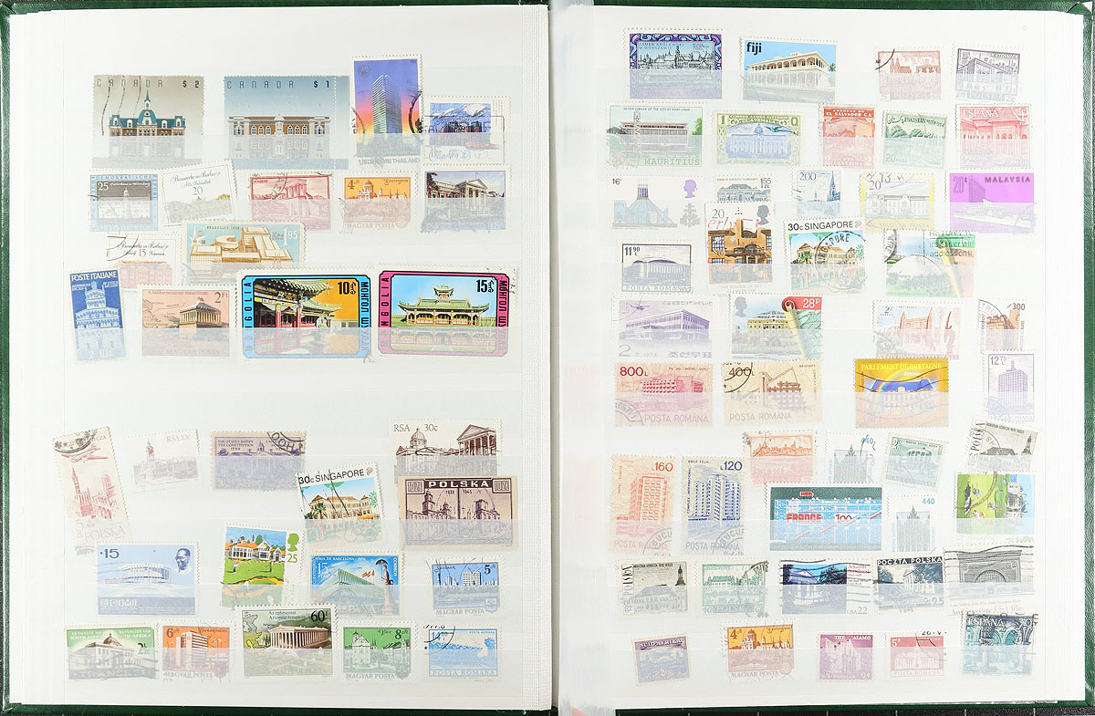 Another one of the ever-popular "Throw everything in a box" lots, with several albums, stockbooks, etc. Lots of "olde time" collections (or parts of collections), all unpicked and offered as received - this one from a local estate. In random order, there is a collection of "H" and "I" countries (strength in Hungary and Italy), from a different source is "J-L" countries. There are two red Simplex springback binders (one with a worldwide air mail collection), with the other with a "sampler" of worldwide material. Two stockbooks have an assortment of worldwide, plus two smaller stockbooks with some interesting back of the book, including revenues and labels. A very battered Scott International album has hundreds (or more) stamps up to 1930, laden with potential. There is a green springback with pre-WWII Germany (and some "States"), and there are even a few loose stockpages rounding things out. Hours of winter fun here! Estimate =