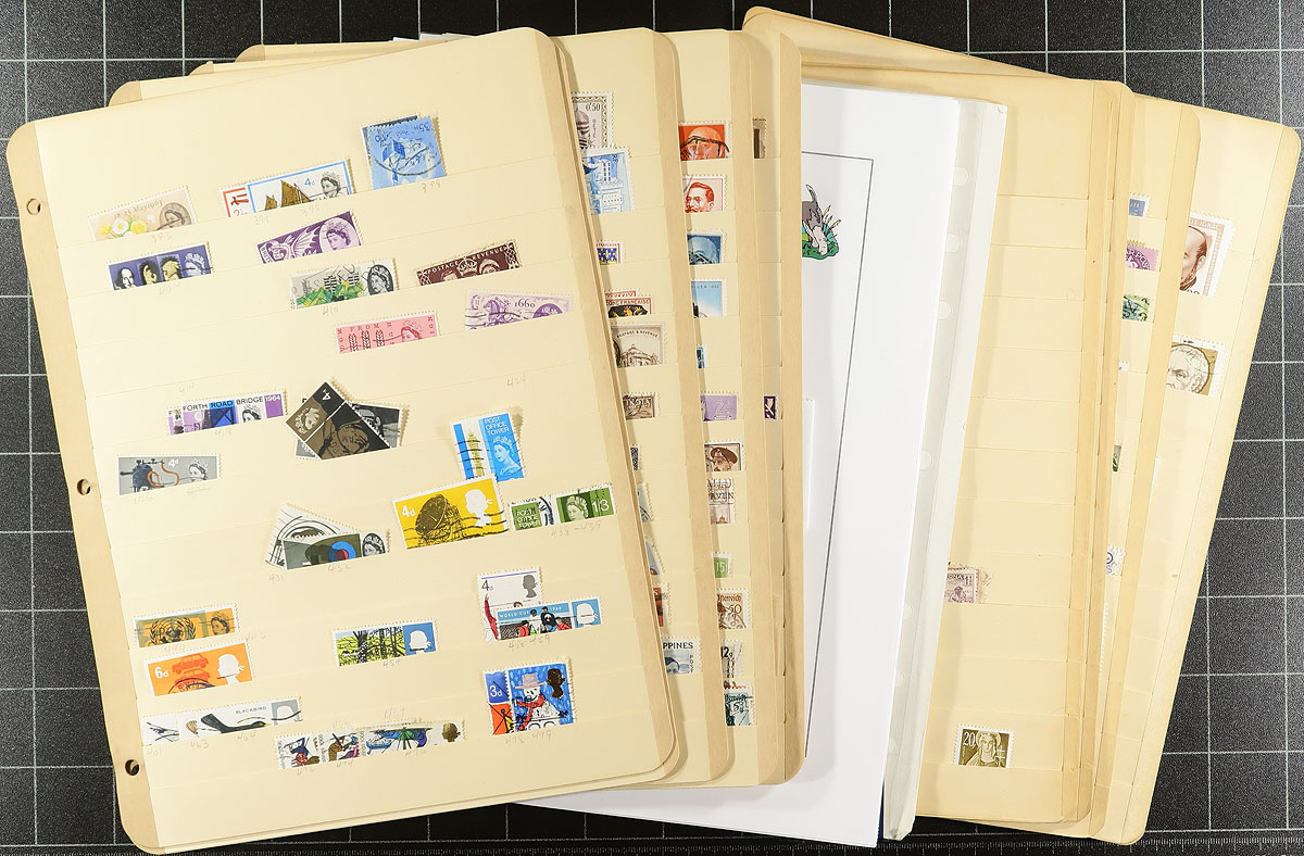 Another one of the ever-popular "Throw everything in a box" lots, with several albums, stockbooks, etc. Lots of "olde time" collections (or parts of collections), all unpicked and offered as received - this one from a local estate. In random order, there is a collection of "H" and "I" countries (strength in Hungary and Italy), from a different source is "J-L" countries. There are two red Simplex springback binders (one with a worldwide air mail collection), with the other with a "sampler" of worldwide material. Two stockbooks have an assortment of worldwide, plus two smaller stockbooks with some interesting back of the book, including revenues and labels. A very battered Scott International album has hundreds (or more) stamps up to 1930, laden with potential. There is a green springback with pre-WWII Germany (and some "States"), and there are even a few loose stockpages rounding things out. Hours of winter fun here! Estimate =