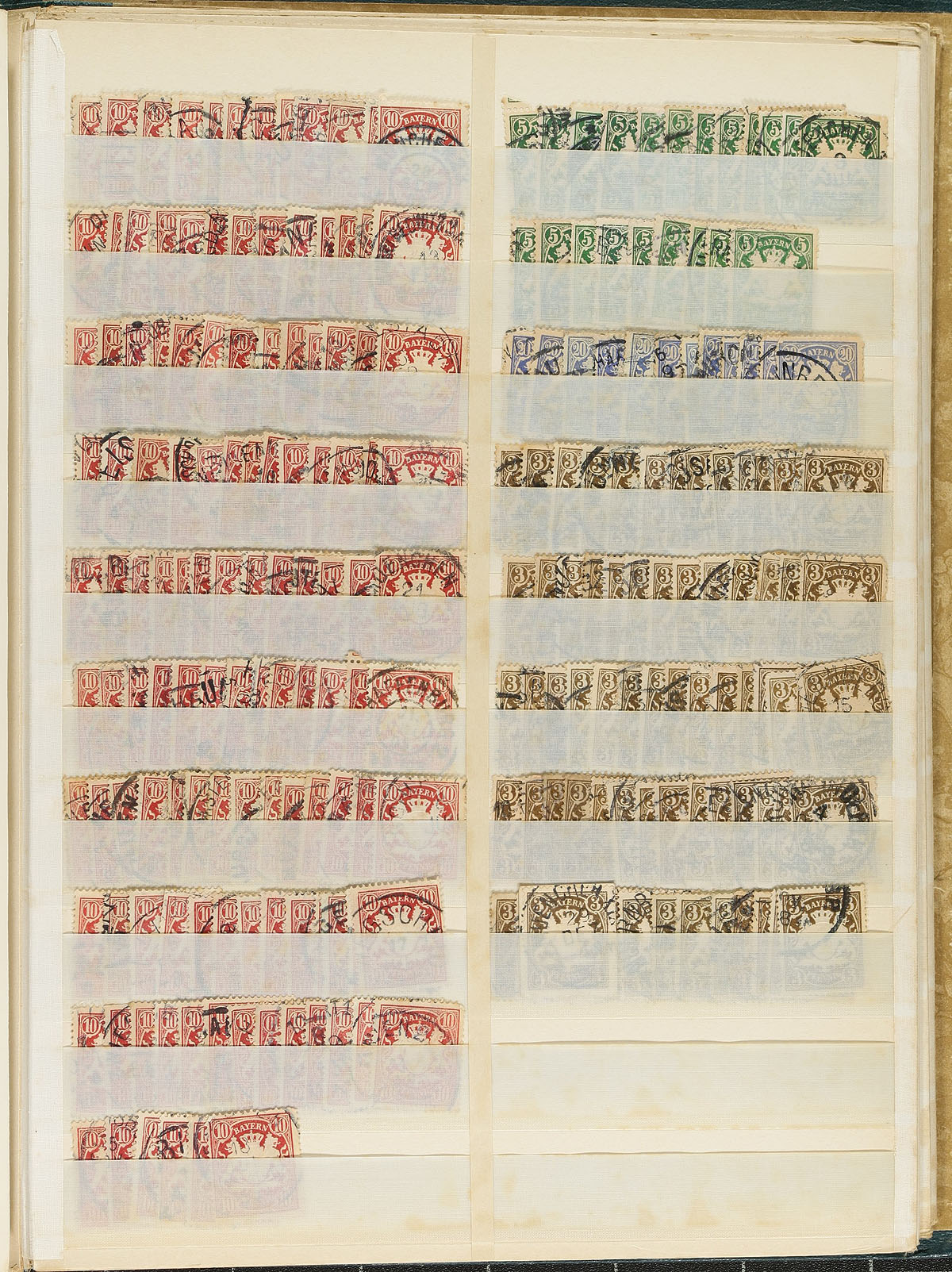 Another one of the ever-popular "Throw everything in a box" lots, with several albums, stockbooks, etc. Lots of "olde time" collections (or parts of collections), all unpicked and offered as received - this one from a local estate. In random order, there is a collection of "H" and "I" countries (strength in Hungary and Italy), from a different source is "J-L" countries. There are two red Simplex springback binders (one with a worldwide air mail collection), with the other with a "sampler" of worldwide material. Two stockbooks have an assortment of worldwide, plus two smaller stockbooks with some interesting back of the book, including revenues and labels. A very battered Scott International album has hundreds (or more) stamps up to 1930, laden with potential. There is a green springback with pre-WWII Germany (and some "States"), and there are even a few loose stockpages rounding things out. Hours of winter fun here! Estimate =