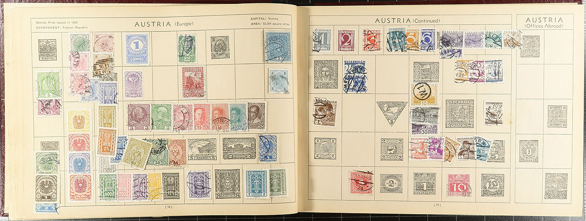 Another one of the ever-popular "Throw everything in a box" lots, with several albums, stockbooks, etc. Lots of "olde time" collections (or parts of collections), all unpicked and offered as received - this one from a local estate. In random order, there is a collection of "H" and "I" countries (strength in Hungary and Italy), from a different source is "J-L" countries. There are two red Simplex springback binders (one with a worldwide air mail collection), with the other with a "sampler" of worldwide material. Two stockbooks have an assortment of worldwide, plus two smaller stockbooks with some interesting back of the book, including revenues and labels. A very battered Scott International album has hundreds (or more) stamps up to 1930, laden with potential. There is a green springback with pre-WWII Germany (and some "States"), and there are even a few loose stockpages rounding things out. Hours of winter fun here! Estimate =