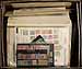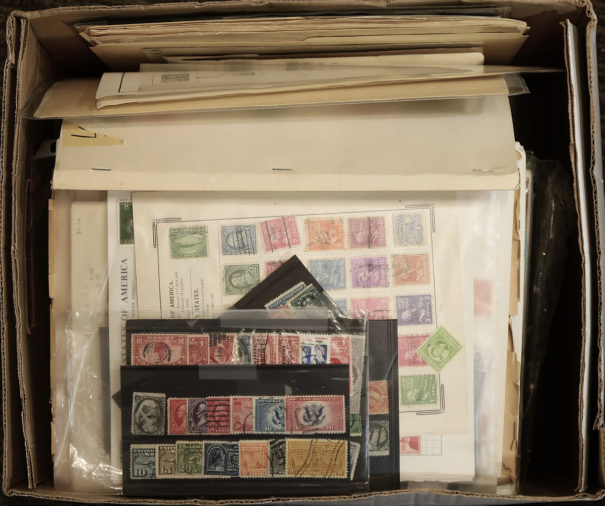 Bankers box filled with the balance of an estate, much of what is former bidboard lots which were purchased and then set aside. Noted a few, mostly used mounted collections up to the 1990's (one album originally sold for over $100), and a number of smaller lots on cards or pages, includes some "classic" 19th century material, some back of the book, a bit of precancel. Disorder and duplication are to be expected, but there could be gems hiding here. Offered as received. Estimate =