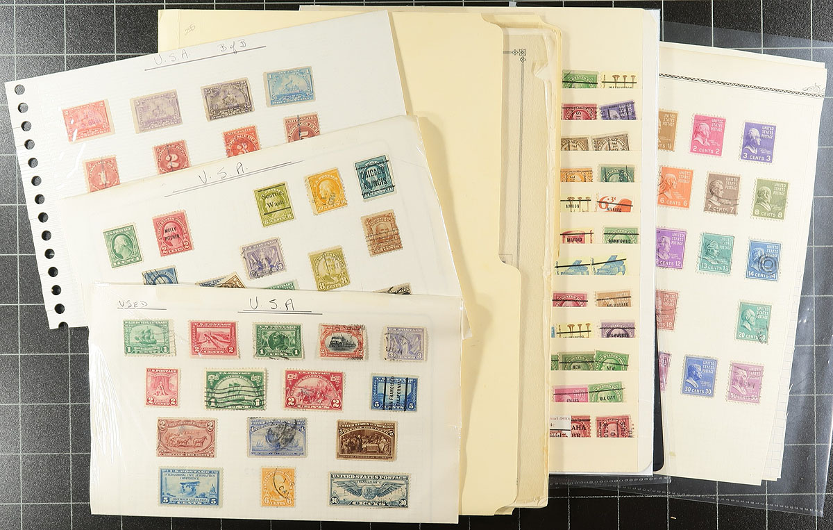 Bankers box filled with the balance of an estate, much of what is former bidboard lots which were purchased and then set aside. Noted a few, mostly used mounted collections up to the 1990's (one album originally sold for over $100), and a number of smaller lots on cards or pages, includes some "classic" 19th century material, some back of the book, a bit of precancel. Disorder and duplication are to be expected, but there could be gems hiding here. Offered as received. Estimate =