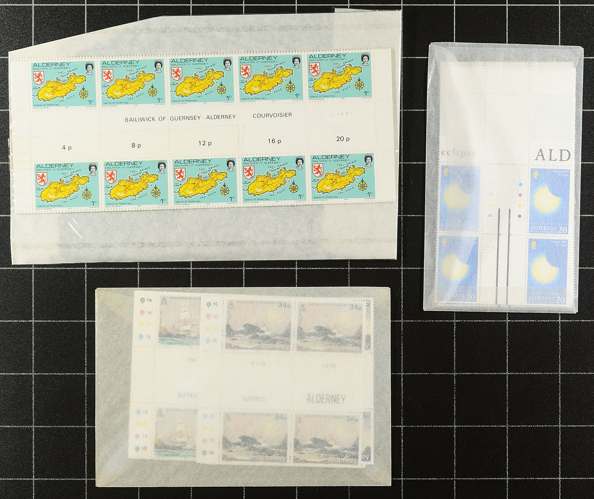 Exceptionally fresh and VF mint NH dealer stock/investment lot of 1983-1999 period issues x 10 examples of each set. Includes the good early sets, all in gutter pairs, blocks and strips. Includes #1-17, 23-41, 43, 44, 55-68, 70-87, 92-97, 114-118, 128-133. Most are complete sets includes the 1987 "Shipwrecks" and the 1994-95 definitives. Alderney material is much harder to find than from the other GB "isles" and clean new issue "troves" like this are few and far between. 2024 Scott US$941.50 =