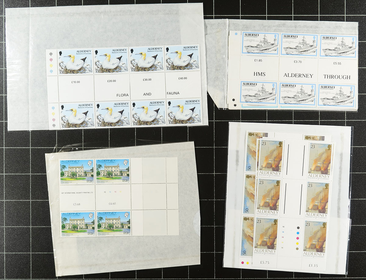Exceptionally fresh and VF mint NH dealer stock/investment lot of 1983-1999 period issues x 10 examples of each set. Includes the good early sets, all in gutter pairs, blocks and strips. Includes #1-17, 23-41, 43, 44, 55-68, 70-87, 92-97, 114-118, 128-133. Most are complete sets includes the 1987 "Shipwrecks" and the 1994-95 definitives. Alderney material is much harder to find than from the other GB "isles" and clean new issue "troves" like this are few and far between. 2024 Scott US$941.50 =