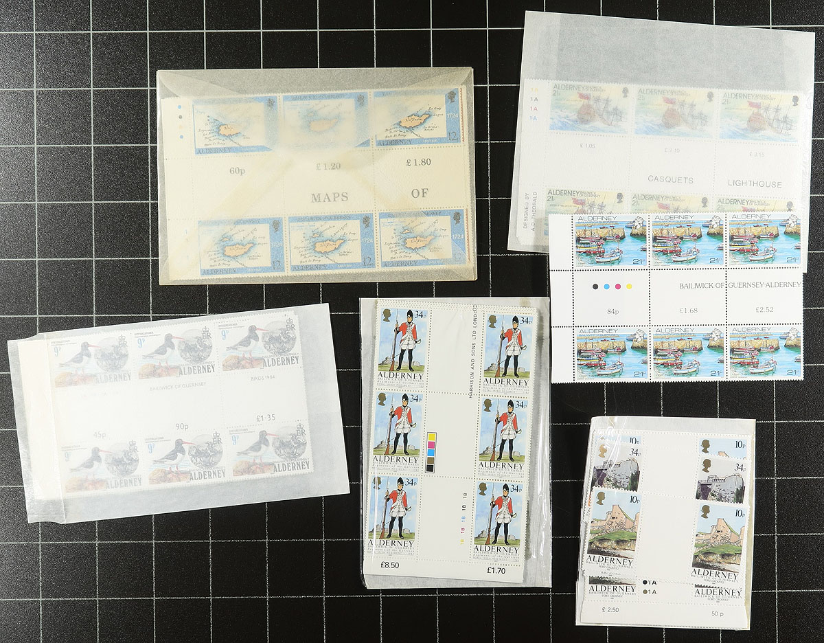 Exceptionally fresh and VF mint NH dealer stock/investment lot of 1983-1999 period issues x 10 examples of each set. Includes the good early sets, all in gutter pairs, blocks and strips. Includes #1-17, 23-41, 43, 44, 55-68, 70-87, 92-97, 114-118, 128-133. Most are complete sets includes the 1987 "Shipwrecks" and the 1994-95 definitives. Alderney material is much harder to find than from the other GB "isles" and clean new issue "troves" like this are few and far between. 2024 Scott US$941.50 =