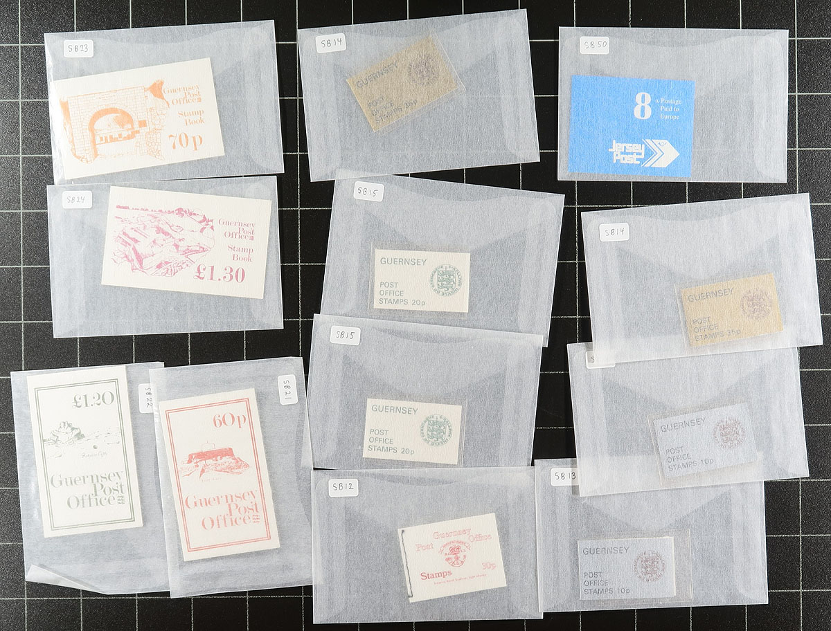 Collection/accumulation of complete booklets (and some souvenir sheets), with 40 items from Guernsey, 16 from Jersey (these 1970s-90s), four Prestige booklets from Alderney (1998-2001) and a few uncounted loose booklets (including some Isle of Man). Many in their original glassines and in terrific condition. Some light duplication amongst the booklets. The face value and catalogue value add up quickly here. Small stationery box. Estimate =