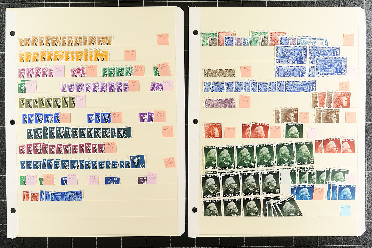 20th century mint regular issue collector’s accumulation neatly laid out on 20 manila stockpages. Includes better singles and sets with up to $15.00 catalogue value, and up to 6 of a type (or set), with a mix of hinged and never hinged. A good mix of definitives and commemoratives, all identified by Scott number and most with (older) catalogue values. Some better that stood out include: #132-5, #182, #200A, #212, #238, #382-6, #426 (x5). A couple bonus items include a forgery of #218 and a couple of modern "Bird" complete booklets. Estimate =