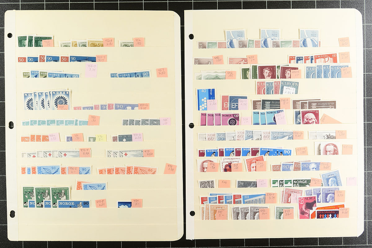 20th century mint regular issue collector’s accumulation neatly laid out on 20 manila stockpages. Includes better singles and sets with up to $15.00 catalogue value, and up to 6 of a type (or set), with a mix of hinged and never hinged. A good mix of definitives and commemoratives, all identified by Scott number and most with (older) catalogue values. Some better that stood out include: #132-5, #182, #200A, #212, #238, #382-6, #426 (x5). A couple bonus items include a forgery of #218 and a couple of modern "Bird" complete booklets. Estimate =