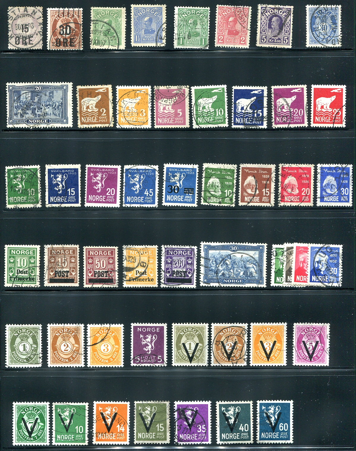 Early to mid-20th century used regular issue stamps, including a few better "Post Horn" issues (including a selection with "V" overprints), some King Haakon (#65, #67), the complete Amundsen Polar Flight issue. Clean stamps with light (often readable) cancels, and no obvious faults. 2024 Scott US$656.00 =
