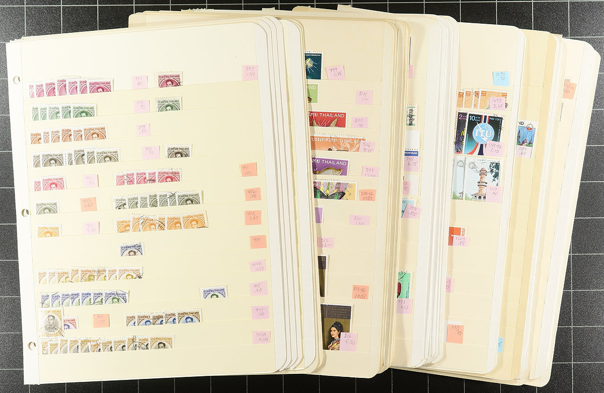 Collector’s duplicates Part #2. A "once in a long while" opportunity to pick through an extensive and well organized, accumulation of mostly used regular issues from the 1960's to about 2000 and a good run of back of the book with semi-postals, air mail and a few officials. Up to 15 of a type, with singles cataloguing $3.00-$15.00 found everywhere. Nicely displayed on 28 manila stock pages. Modern Thailand stamps often have surprising catalogue value and also some great topical appeal. Build your collection and sell the balance. Very clean material with few faults. Estimate =
