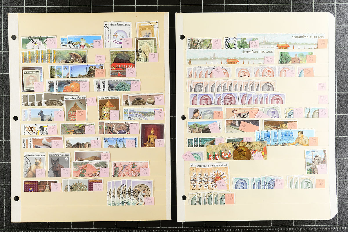 Collector’s duplicates Part #2. A "once in a long while" opportunity to pick through an extensive and well organized, accumulation of mostly used regular issues from the 1960's to about 2000 and a good run of back of the book with semi-postals, air mail and a few officials. Up to 15 of a type, with singles cataloguing $3.00-$15.00 found everywhere. Nicely displayed on 28 manila stock pages. Modern Thailand stamps often have surprising catalogue value and also some great topical appeal. Build your collection and sell the balance. Very clean material with few faults. Estimate =