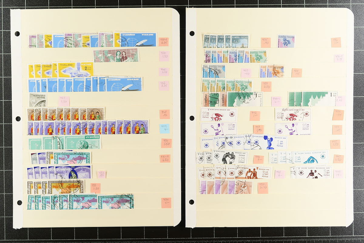 Collector’s duplicates Part #2. A "once in a long while" opportunity to pick through an extensive and well organized, accumulation of mostly used regular issues from the 1960's to about 2000 and a good run of back of the book with semi-postals, air mail and a few officials. Up to 15 of a type, with singles cataloguing $3.00-$15.00 found everywhere. Nicely displayed on 28 manila stock pages. Modern Thailand stamps often have surprising catalogue value and also some great topical appeal. Build your collection and sell the balance. Very clean material with few faults. Estimate =