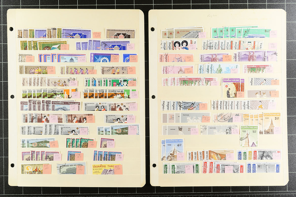 Collector’s duplicates Part #2. A "once in a long while" opportunity to pick through an extensive and well organized, accumulation of mostly used regular issues from the 1960's to about 2000 and a good run of back of the book with semi-postals, air mail and a few officials. Up to 15 of a type, with singles cataloguing $3.00-$15.00 found everywhere. Nicely displayed on 28 manila stock pages. Modern Thailand stamps often have surprising catalogue value and also some great topical appeal. Build your collection and sell the balance. Very clean material with few faults. Estimate =