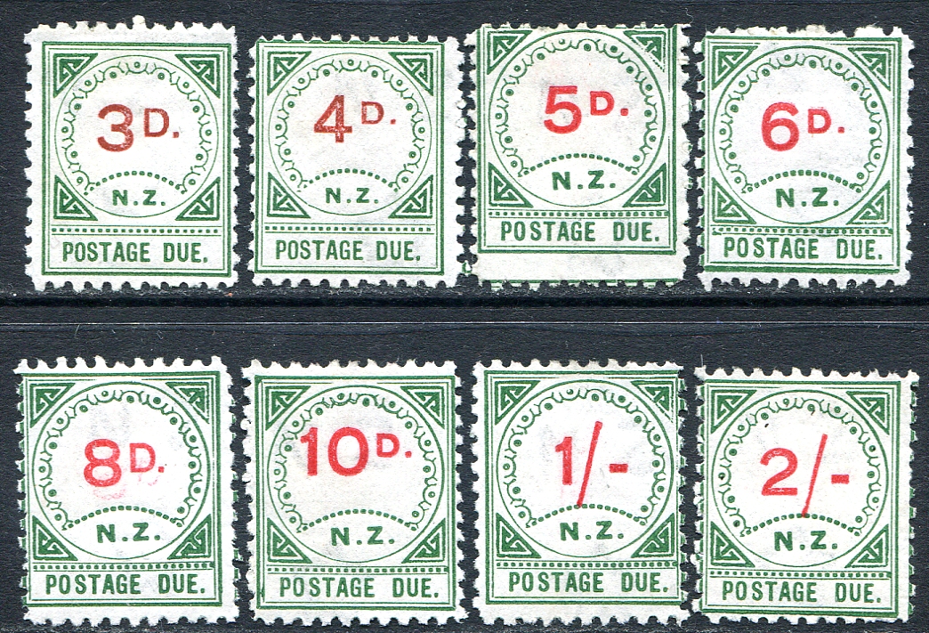This first postage due issue of 1899 is missing only the 3 lowest denominations. The balance of the set is here, with 8 values going up to 2/-. Fresh mint, usual mixed perfs and poor centring. Most have minor hinge remnants, as is often the case, otherwise there is lots of original gum here. Not often seen. 2024 Scott US$802.50 =