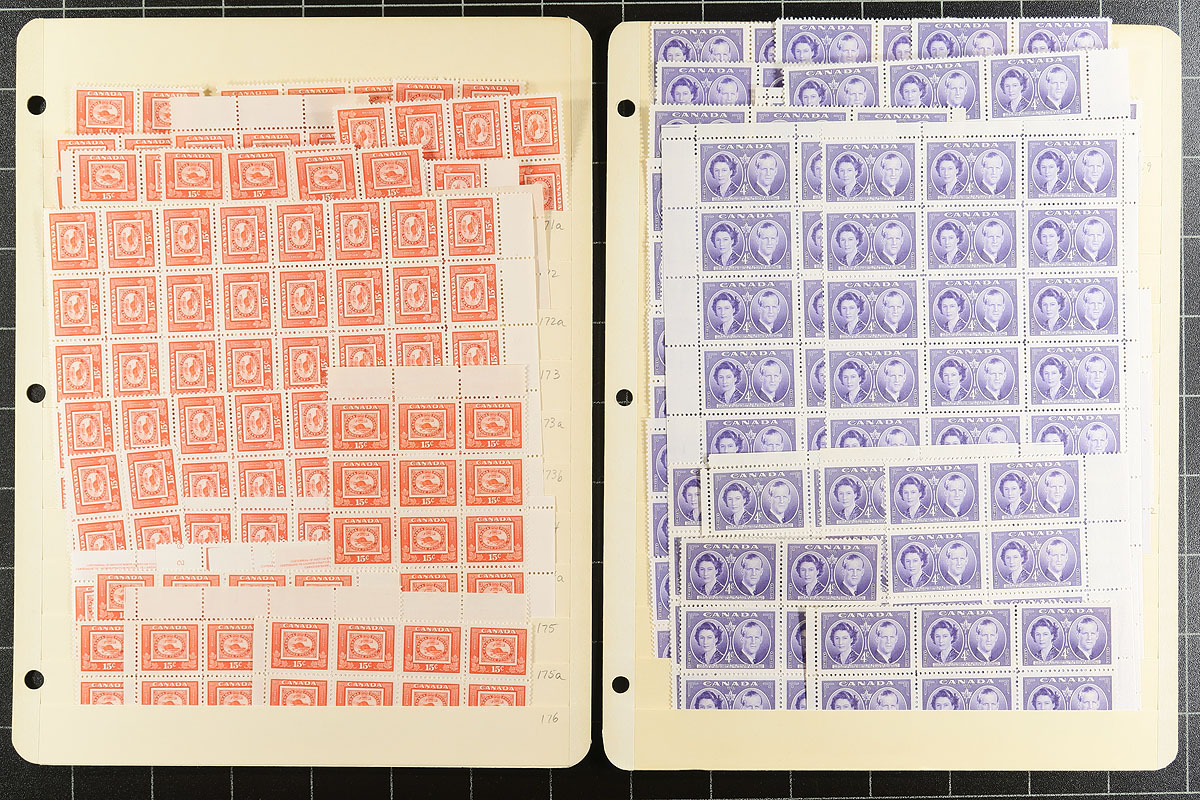 Volume 1 Mint Canada wholesale stock (#284/342). This volume is late King George VI to early Queen Elizabeth II. Generally one issue per stockpage. Anywhere from 20 to a couple hundred stamps per page. Lots of multiples with relatively few plate blocks. A quick check indicates that most, if not all, are never hinged. We noted better, such as Capex ’51, Totem dollar (72 copies, including a few plate blocks), 50c Textiles (nearly 100 copies including several plate blocks), and some plate blocks amongst the QEII Wilding issue. Enormous catalogue value here and a conservative face value (no premiums for "better" or plate blocks is $343.00. Estimate =